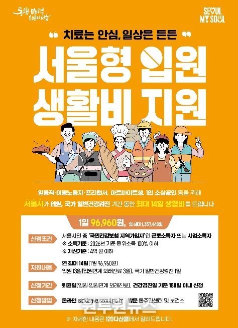 신청은 ‘서울형 입원 생활비 지원’ 누리집을 통해 온라인으로 가능하며, 거주지 관할 동 주민센터 또는 구 보건소 방문 신청도 가능하다. 신청 기한은 퇴원일 또는 건강검진일로부터 180일 이내다. 자세한 사항은 구 보건소 누리집 ‘사업안내-의료비 지원사업’ 게시판에서 확인할 수 있다.