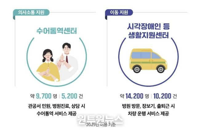 이외에도 ‘수어통역센터’는 관공서 민원, 병원 진료, 상담 등 다양한 상황에서 수어통역 서비스를 제공해 청각·언어장애인의 정보 접근과 사회활동을 돕고 있으며, 지난해 약 9,700명에게 5,200건의 서비스를 제공했다. 또한 ‘시각장애인등 생활지원센터’는 시각장애 등으로 이동에 어려움을 겪는 시민들에게 차량 운행 서비스를 제공해 병원 방문, 장보기, 출퇴근 등 다양한 일상 활동을 지원하고 있다. 지난해에는 약 1만 4,200명이 1만 200건의 서비스를 이용했다.