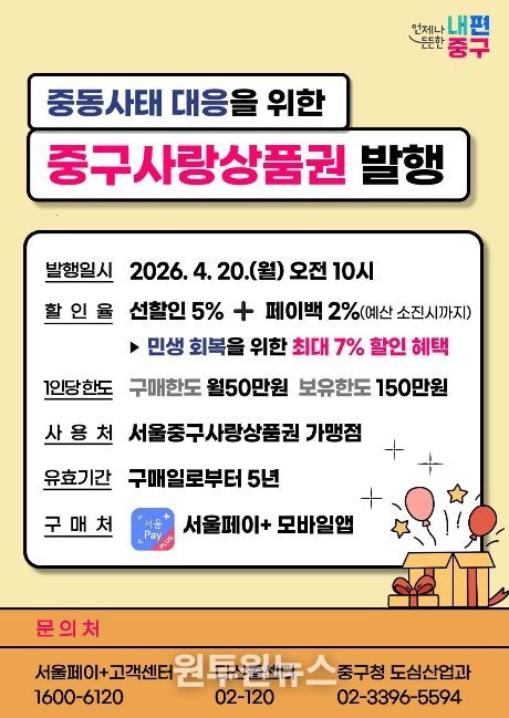 (원투원뉴스) 서울 중구가 중동전쟁으로 인한 경기 불안과 소비 위축에 대응하기 위해 20억 원 규모의 '서울중구사랑상품권'을 오는 20일 발행한다.