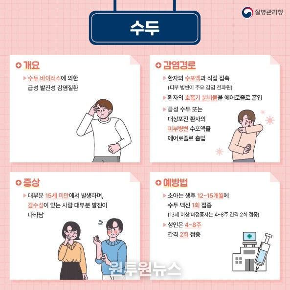 수두는 발열과 수포성 발진이 나타나는 바이러스성 감염병이다. 환자의 수포액과 직접 접촉하거나 기침·재채기 등 호흡기 분비물을 통해 쉽게 전파된다. 약 2주의 잠복기를 거쳐 증상이 나타나며, 모든 수포에 가피(딱지)가 형성될 때까지 전염력이 있어 집단생활 환경에서 확산 위험이 높다.