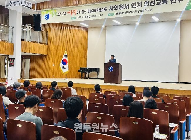 (원투원뉴스) 대전동·서부교육지원청은 4월 15일 대전동부교육지원청 대강당에서 동·서부 관내 중학교 사회정서 교육 및 인성 교육 담당 교사 120여 명을 대상으로 ‘울림으로 잇고 어울림으로 맺는 사회정서 연계 인성 교육 연수’를 실시했다고 밝혔다.