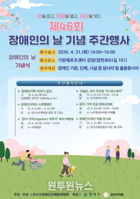 (원투원뉴스) 서울 강서구는 4월 20일 장애인의 날을 맞아, 오는 18일부터 일주일간 ‘제46회 장애인의 날 기념 주간행사’를 개최한다고 밝혔다.