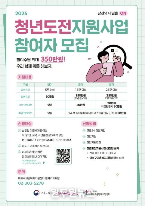 (원투원뉴스) 마포구가 구직단념청년의 사회 재진입을 돕는 ‘청년도전지원사업’ 규모를 130명으로 확대하며 지원을 강화한다.