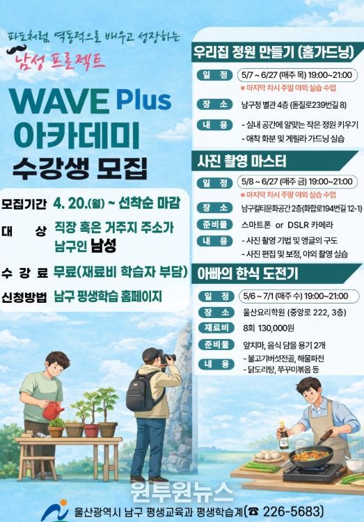 (원투원뉴스) 울산 남구는 남성 학습자의 평생교육 참여 확대를 위해 ‘WAVE Plus 아카데미’ 수강생을 오는 20일부터 선착순으로 총 80명 모집한다고 16일 밝혔다.