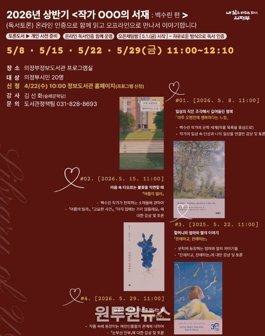 (원투원뉴스) 의정부시는 2026년 상반기 ‘작가 OOO의 서재: 백수린 편’을 5월 매주 금요일(8일, 15일, 22일, 29일) 총 4회에 걸쳐 의정부정보도서관에서 운영한다.