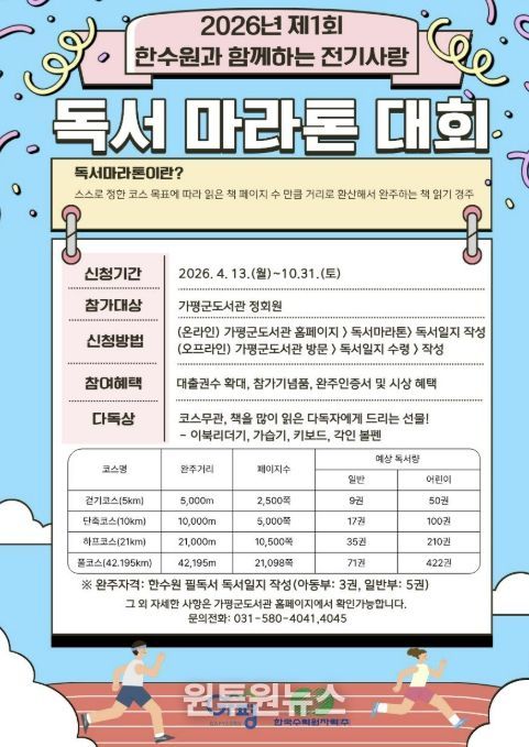 (원투원뉴스) 가평군이 한국수력원자력㈜ 청평수력발전소의 지원을 바탕으로 ‘전기사랑 독서마라톤’의 본격적인 레이스에 돌입했다.