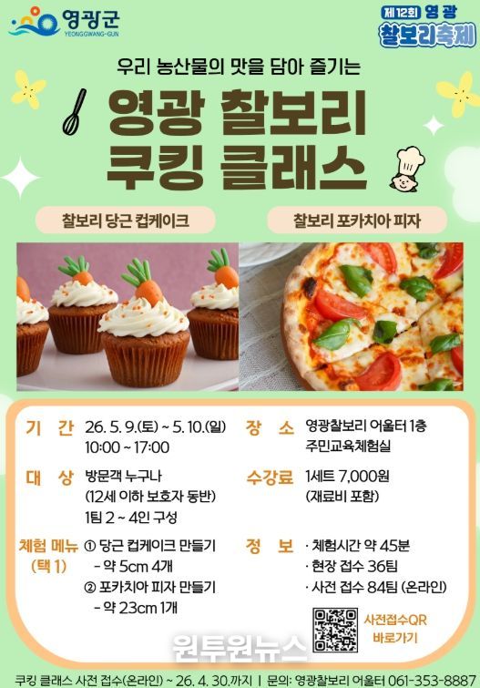 (원투원뉴스) 영광군은 오는 5월 9일부터 5월 10일까지 열리는 ‘영광 찰보리 축제’ 기간 동안, 찰보리를 활용한 체험 프로그램인 ‘찰보리 쿠킹클래스’를 운영한다고 밝혔다.