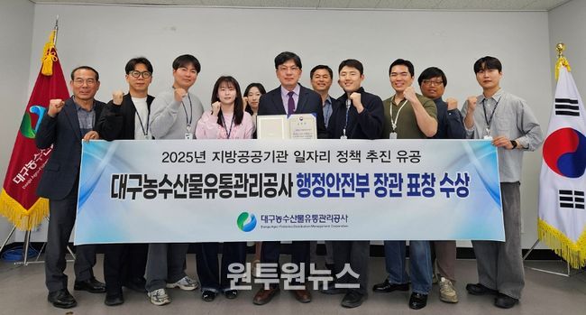 (원투원뉴스) 대구농수산물유통관리공사는 지역사회 양질의 일자리 창출 및 고용 개선에 기여한 공로를 인정받아 ‘지방공공기관 일자리 정책 추진 유공’ 분야 행정안전부 장관 표창을 수상했다.