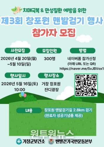이정헌 보건소장은 “이번 행사를 통해 군민들이 일상 속 걷기 실천을 자연스럽게 이어갈 수 있는 계기가 되기를 바란다”며 “가족, 이웃과 함께 창포원에서 건강한 시간을 보내시길 바란다”고 말했다.