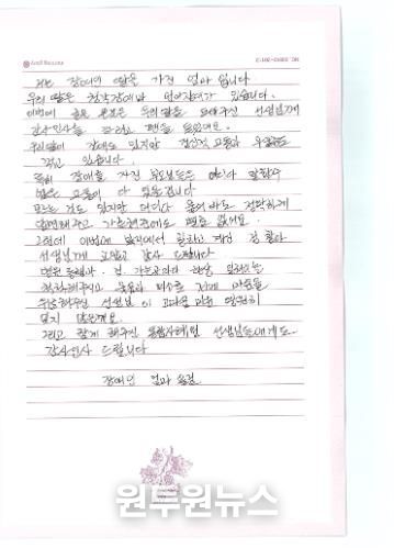 어머니는 편지에서 “청각장애와 언어장애뿐 아니라 정신적 고통까지 겪는 딸을 보며 어디에도 말할 곳이 없어 막막했다”며 “병원 동행부터 행정 절차까지 세심하게 도와주시고, 늘 웃음과 따뜻한 말로 위로해주신 선생님께 깊이 감사드린다”고 전했다.