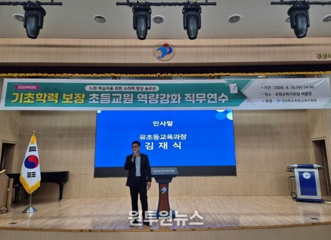 (원투원뉴스) 포항교육지원청은 4월 15일 포항교육지원청 여울관에서 포항·영덕·청송 지역 기초학력 업무 담당교사 및 담임교사를 대상으로 2026 기초학력 보장 초등교원 역량강화 직무연수를 실시했다.