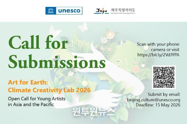 (원투원뉴스) 제주특별자치도가 유네스코(UNESCO)와 새롭게 공동 추진 중인 ‘Je Create: 지속가능한 미래를 위한 문화와 혁신’ 사업의 일환으로, ‘Art for Earth: 기후 창의성 랩 2026’에 참여할 청년예술가를 오는 5월 15일까지 공개 모집한다.
