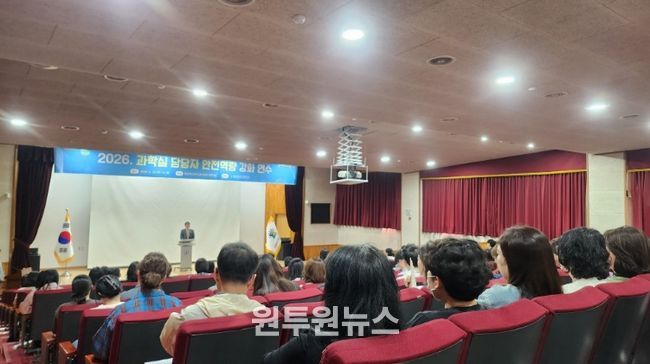 (원투원뉴스) 청주교육지원청은 지난 16일, 청주교육지원청 대회의실에서 관내 초·중학교 과학실 담당자 145명을 대상으로 ‘2026학년도 과학실 담당자 안전역량 강화 연수’를 실시했다.