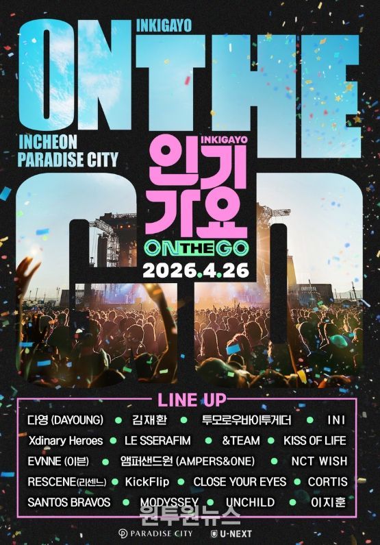 오는 4월 26일(일) 인천 파라다이스시티에서 개최되는 ‘인기가요 ON THE GO’는 SBS 대표 음악 프로그램 ‘인기가요’의 스페셜 공연 프로젝트로, 기존 스튜디오 중심의 음악 방송을 넘어 팬들이 있는 곳으로 직접 찾아가는 콘셉트로 기획됐다. 생방송 현장의 에너지와 공연의 몰입감을 결합한 새로운 형태의 K-POP 공연으로, 아티스트와 관객이 더욱 가까이 호흡하는 특별한 경험을 선사할 예정이다.