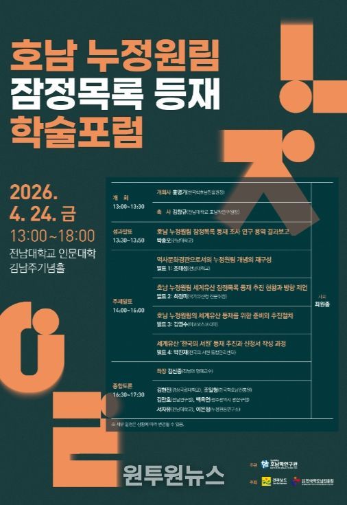 17일 전남대학교에 따르면, ‘호남 누정원림 잠정목록 등재 학술포럼’이 오는 4월 24일 오후 1시부터 6시까지 전남대학교 인문대학 김남주기념홀에서 개최된다.