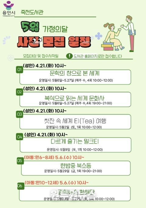 (원투원뉴스) 용인특례시 죽전도서관은 오는 5월 가정의 달을 맞아 ‘2026년 5월 독서문화행사’를 개최한다.