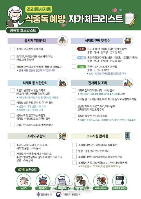 또 칼과 도마는 어류‧육류‧채소류 등으로 구별해 쓰고, 사용한 칼과 도마 등은 반드시 세척‧소독해야 한다고 했다. 조리한 음식은 최소 2시간 이내에 먹을 것도 권장했다.