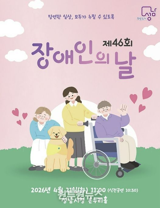 (원투원뉴스) 성남시는 ‘제46회 장애인의 날(4.20)’을 맞아 오는 4월 21일 오전 11시 시청 1층 온누리에서 기념식을 연다.