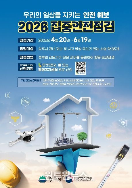 (원투원뉴스) 원주시는 4월 20일부터 6월 19일까지 61일간 ‘2026년 집중안전점검’을 추진한다.