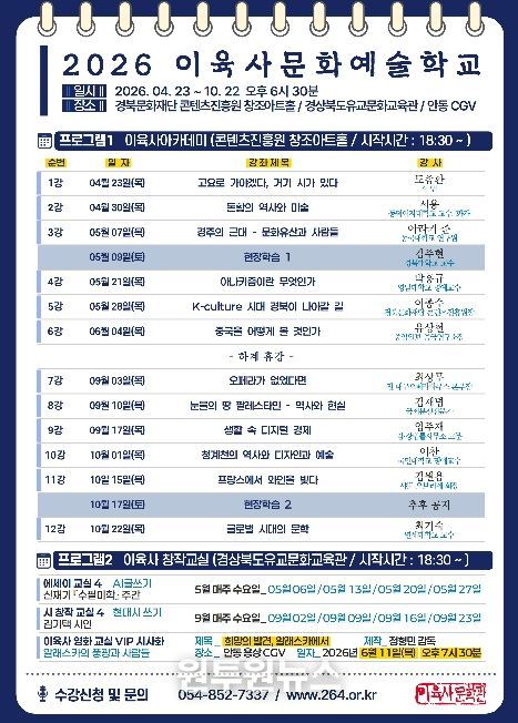 (원투원뉴스) 안동시 이육사문학관은 4월 23일부터 '2026 이육사문화예술학교'를 개강한다. '2026 이육사문화예술학교'는 국내외 저명 강사들이 참여해 인문․예술 전반의 다양한 주제를 다루며, 시민이 일상에서 인문학의 깊이를 체감할 수 있도록 풍성하고 내실 있는 강연으로 운영된다.