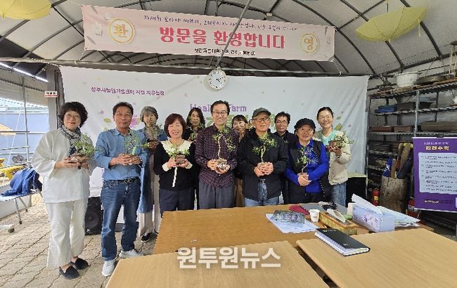(원투원뉴스) 상주시농업기술센터에서 육성·지원하는 상주시 치유농업연구회는 지난 14일 회원 10여 명이 참여한 가운데 회원 농장인 힐링팜보리뜰분재원에서 ‘내 인생의 분갈이’를 주제로 한 치유농업 프로그램 시연회를 개최했다.