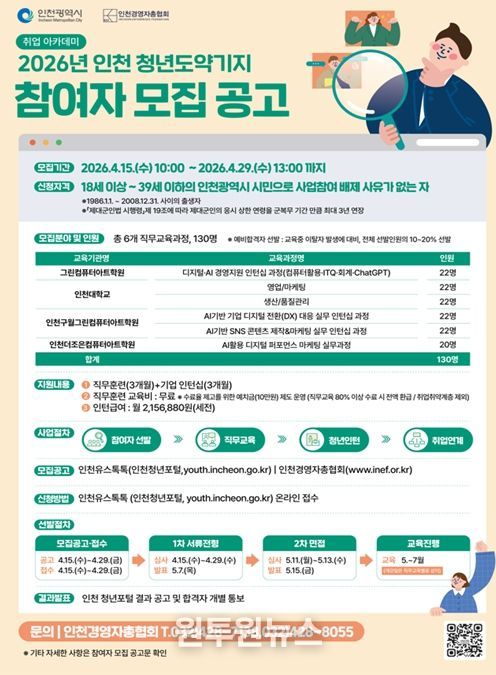 (원투원뉴스) 인천광역시는 청년의 취업역량을 강화하고 지역기업이 필요로 하는 실무형 인재를 양성하기 위해 ‘2026 인천 청년도약기지’ 사업 참여자 130명을 4월 15일부터 4월 29일까지 모집한다고 밝혔다.