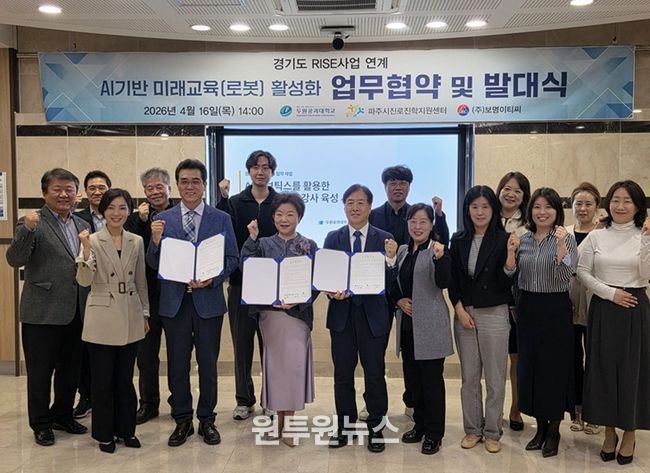 파주시 민간위탁 시설인 ‘파주시 진로진학지원센터’는 지난 16일 두원공과대학교 파주캠퍼스에서 두원공과대학교·㈜보명이티씨와 함께, 경기도 지역혁신중심 대학지원체계(RISE) 사업과 연계한 ‘인공지능(AI) 기반 미래인재육성 및 교육협력을 위한 다자간 업무협약’을 체결했다.