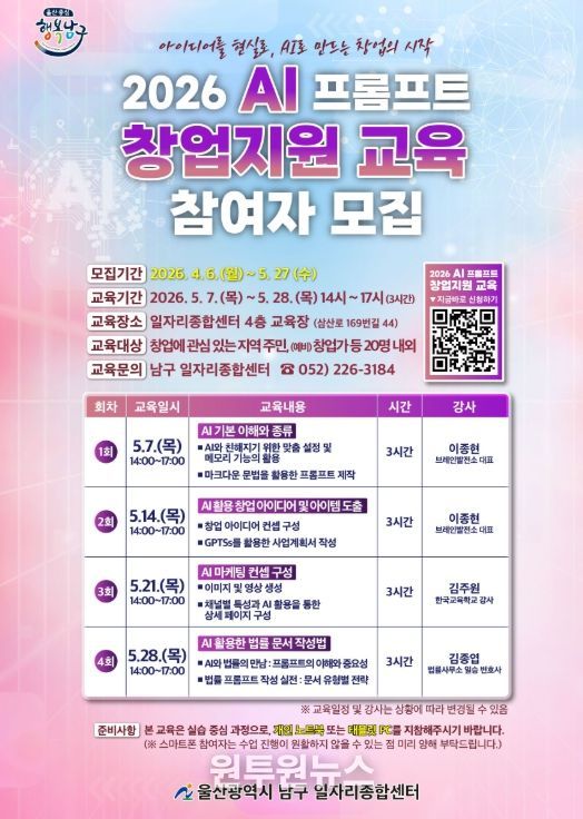 (원투원뉴스) 울산 남구 일자리종합센터는 급변하는 AI(인공지능) 산업 환경에 발맞춰 지역 예비 창업자들을 위한 ‘2026 Al 프롬프트 창업지원 과정’ 교육생을 모집하고 있다고 17일 밝혔다.