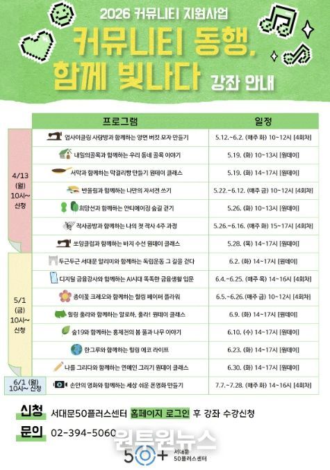 (원투원뉴스) 서대문구가 운영하는 서대문50플러스센터가 중장년의 자기 계발과 사회참여를 지원하는 교육 프로그램 ‘커뮤니티 동행, 함께 빛나다’를 센터 내 강의실과 야외 현장에서 5∼7월 운영한다.