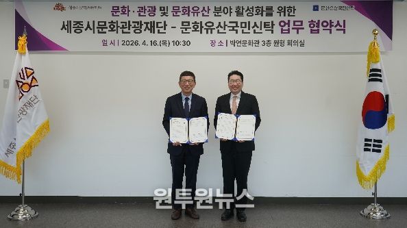 이날 협약식에는 박영국 세종시문화관광재단 대표이사와 이상현 문화유산국민신탁 이사장이 참석해, 양 기관 협력 강화를 통한 문화·관광 및 문화유산 분야 발전과 시민 문화 향유 기회 확대에 뜻을 모았다.
