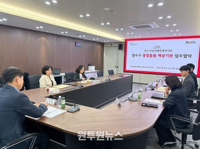 (원투원뉴스) 연수구는 지난 16일 구청 제2영상회의실에서 ‘연수 온동네 통합케어사업 특화서비스’의 원활한 추진과 질적 향상을 위해 전문 서비스 제공기관들과 업무협약을 체결했다.