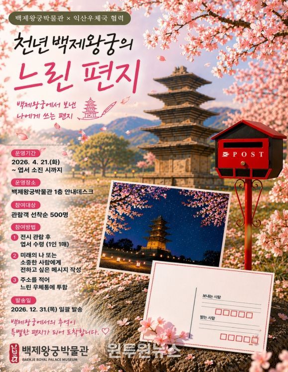 익산시 백제왕궁박물관은 익산우체국과 협력해 관람객 참여형 프로그램 '천년 백제왕궁의 느린 편지'를 오는 21일부터 운영한다.