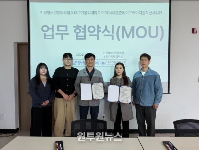 (원투원뉴스) 진량청소년문화의집은 지역 청소년들에게 심리, 상담, 활동 등 다양한 경험을 지원하기 위하여 16일 대구가톨릭대학교 RISE 세대공존 라이프케어 지원혁신사업단과 업무협약을 체결했다.