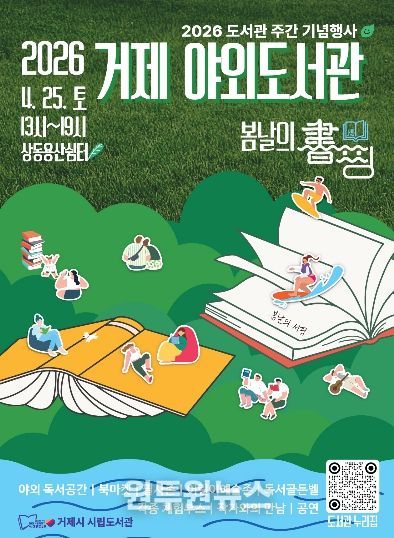 (원투원뉴스) 거제시 시립도서관은 4월 도서관 주간을 맞아 오는 4월 25일 상동동 용산쉼터에서 시민 참여형 야외 독서문화 행사인 2026 거제 야외도서관 『봄날의 書(서)핑』을 개최한다.