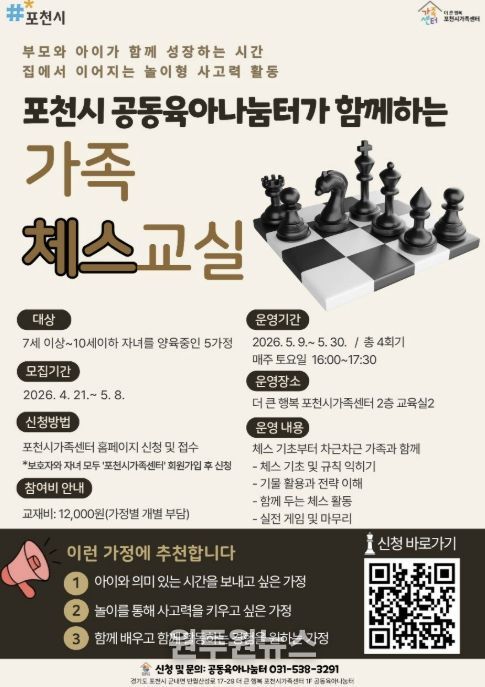(원투원뉴스) 포천시 더 큰 행복 포천시가족센터는 공동육아나눔터 상시 프로그램의 일환으로 아동의 논리적 사고력 향상과 부모-자녀 간 긍정적 상호작용을 지원하기 위해 가족 참여형 체스 프로그램 '가족 체스 교실'을 운영한다고 밝혔다.