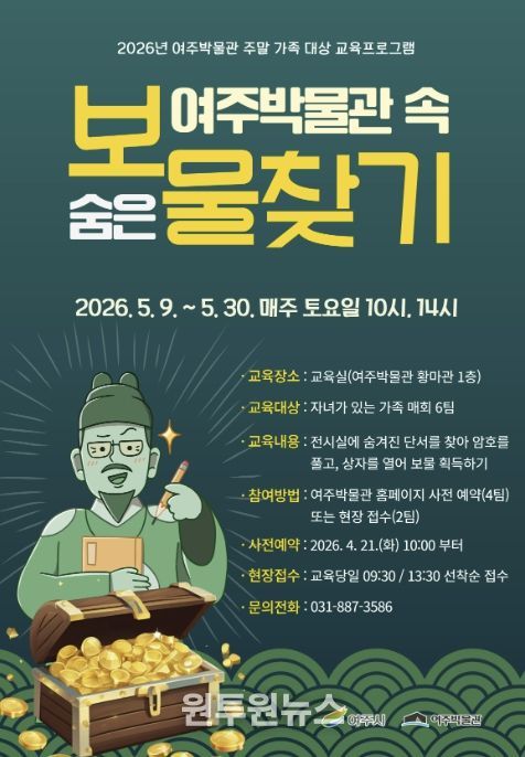 (원투원뉴스) 여주시 여주박물관은 가정의 달 5월을 맞아 가족이 함께 지역 문화유산의 가치를 즐겁게 배우고 체험할 수 있는 ‘여주박물관 속 숨은 보물찾기’를 운영한다.