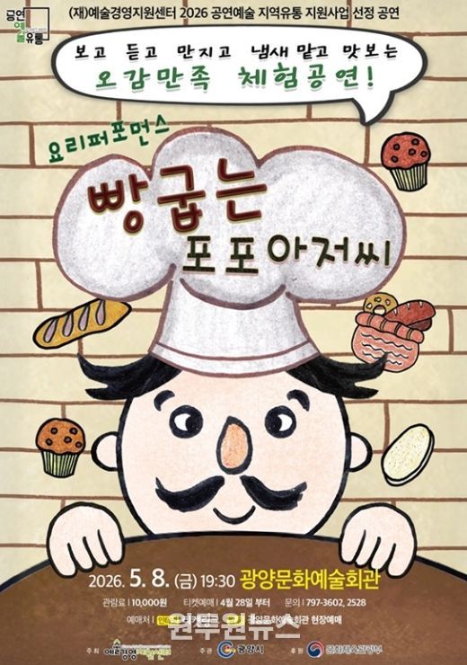 (원투원뉴스) 광양시는 5월 가정의 달을 맞아 오는 5월 8일 오후 7시 30분 광양문화예술회관 대공연장에서 극단선물의 어린이 참여형 뮤지컬 ‘빵굽는 포포아저씨’를 선보인다고 밝혔다.
