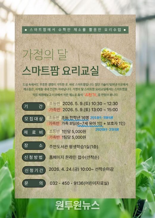 (원투원뉴스) 인천광역시교육청주안도서관은 5월 가정의 달을 맞아 오는 5월 9일 ‘스마트팜 요리교실’을 운영한다.