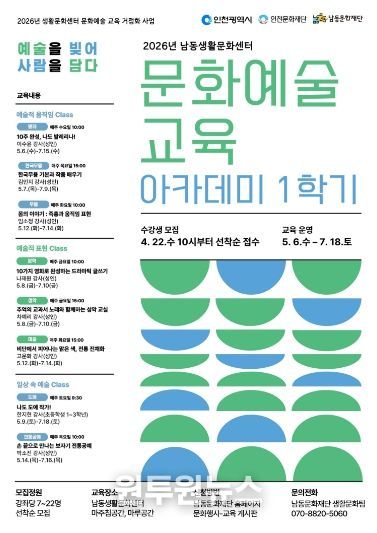(원투원뉴스) 인천시 남동문화재단은 오늘 5월 6일부터 7월 18일까지 남동생활문화센터에서 ‘2026년 남동생활문화센터 문화예술 교육 아카데미 1학기’를 운영한다고 17일 전했다.
