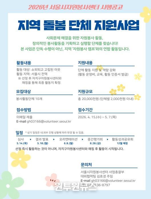 (원투원뉴스) 서울시자원봉사센터는 복지 사각지대 주민의 외로움 해소를 위해 자치구자원봉사센터(자원봉사 캠프)와 협력하여 신규 봉사활동을 기획하고 운영할 비영리 단체를 모집한다고 밝혔다.