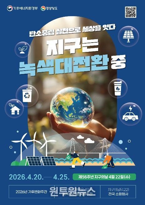 (원투원뉴스) 경상남도는 56주년 ‘지구의 날’을 기념해 탄소중립에 대한 도민 인식을 높이고 생활 속 실천 문화를 확산하기 위해 20일부터 24일까지 5일간 ‘제18회 기후변화주간’을 운영한다고 밝혔다.
