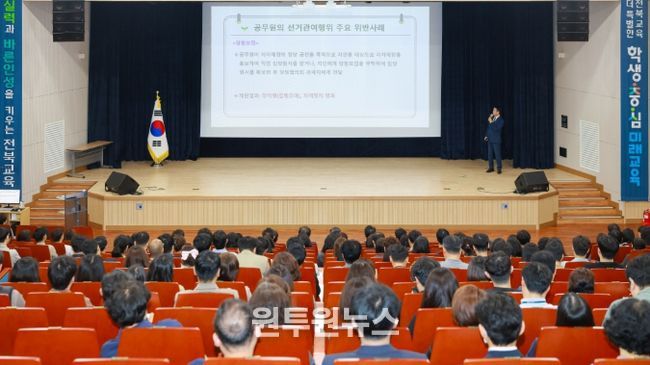 (원투원뉴스) 전북특별자치도교육청은 6월 3일 치러지는 전국동시지방선거를 앞두고 공무원의 정치적 중립 의무에 대한 이해를 높이고 선거 관련 위법행위를 사전에 예방하기 위해 17일 창조나래 시청각실에서 전 직원 대상 직장교육을 실시했다.