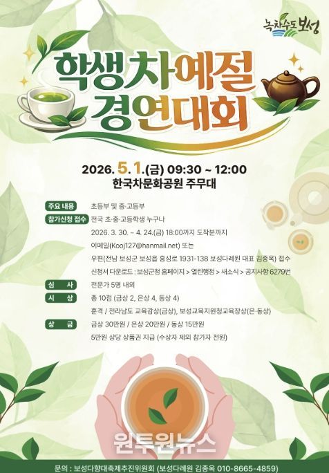 (원투원뉴스) 보성군은 오는 24일 18시까지 ‘2026 학생차예절경연대회’에 참가할 전국 초·중·고등학생을 모집한다고 밝혔다.
