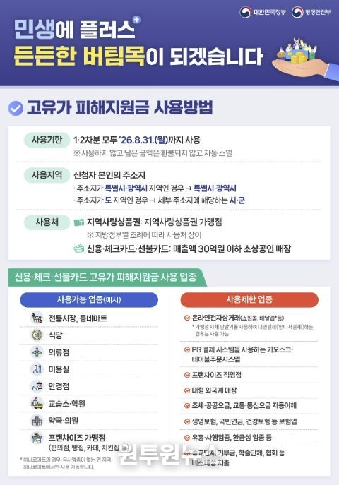 지원금은 지역사랑상품권(공주페이), 신용카드·체크카드, 선불카드 중에서 선택하여 지급받을 수 있으며, 연 매출 30억 원 이하 소상공인 매장에서 사용할 수 있다. 사용 기한은 올 8월 31일 자정까지이며, 그 이후에는 소멸된다.