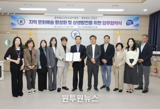 (원투원뉴스) 충북 진천군과 진천교육지원청은 17일 진천교육지원청 온누리홀에서 ‘지역 문화예술 활성화와 상생발전’을 위한 업무협약을 체결했다고 밝혔다.