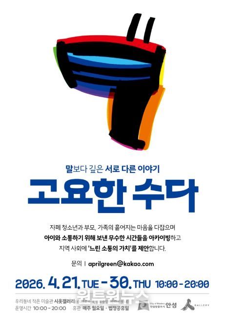 (원투원뉴스) 안성시 시옷갤러리는 오는 4월 21일부터 4월 30일까지 자폐 청소년과 그 가족이 함께 참여하는 전시 《고요한 수다》를 개최한다고 밝혔다.