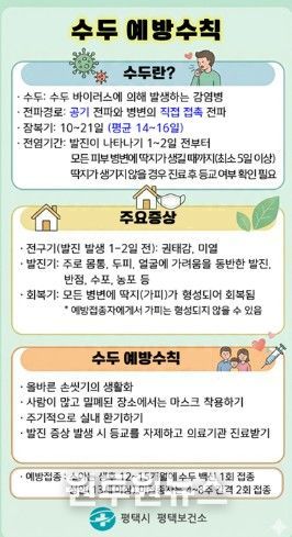 평택보건소 관계자는 “수두는 어린이집, 유치원, 학교 등 집단시설에서 쉽게 전파될 수 있어 가정과 시설의 적극적인 협조가 중요하다”며, “지속적인 감염병 발생 동향 모니터링과 예방 홍보를 통해 시민 건강 보호에 최선을 다하겠다”고 밝혔다.