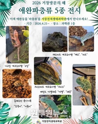 (원투원뉴스) 거창군은 거창천적생태과학관에서 2026년 ‘거창방문의 해’를 맞아 오는 21일부터 어린이와 학생, 가족 관람객을 대상으로 이색 애완 파충류 전시를 개최한다고 밝혔다.