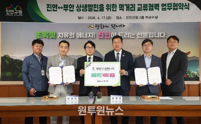 (원투원뉴스) 진안군은 17일 군청 부군수실에서 부안군과 지역 먹거리 상생발전 및 교류 협력 강화를 위한 업무협약(MOU)을 체결했다.
