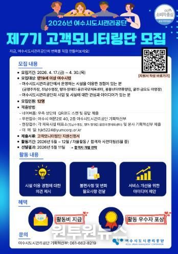 (원투원뉴스) 여수시도시관리공단은 시민 참여를 기반으로 공단 시설과 서비스 품질을 점검하고 개선하기 위한 '2026년 제7기 고객모니터링단'을 모집한다고 밝혔다.